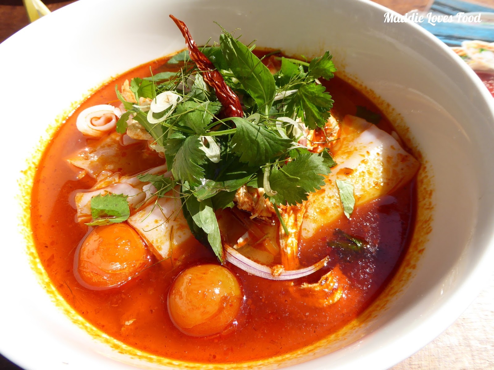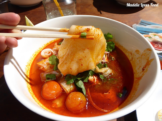 Instead of conventional rice noodles, large, soft rice noodle sheets are rolled up and placed into the broth. These slippery, delicate layers unfold to soak up all of the wonderful flavours of the tom yum, and are my favourite part of the meal.