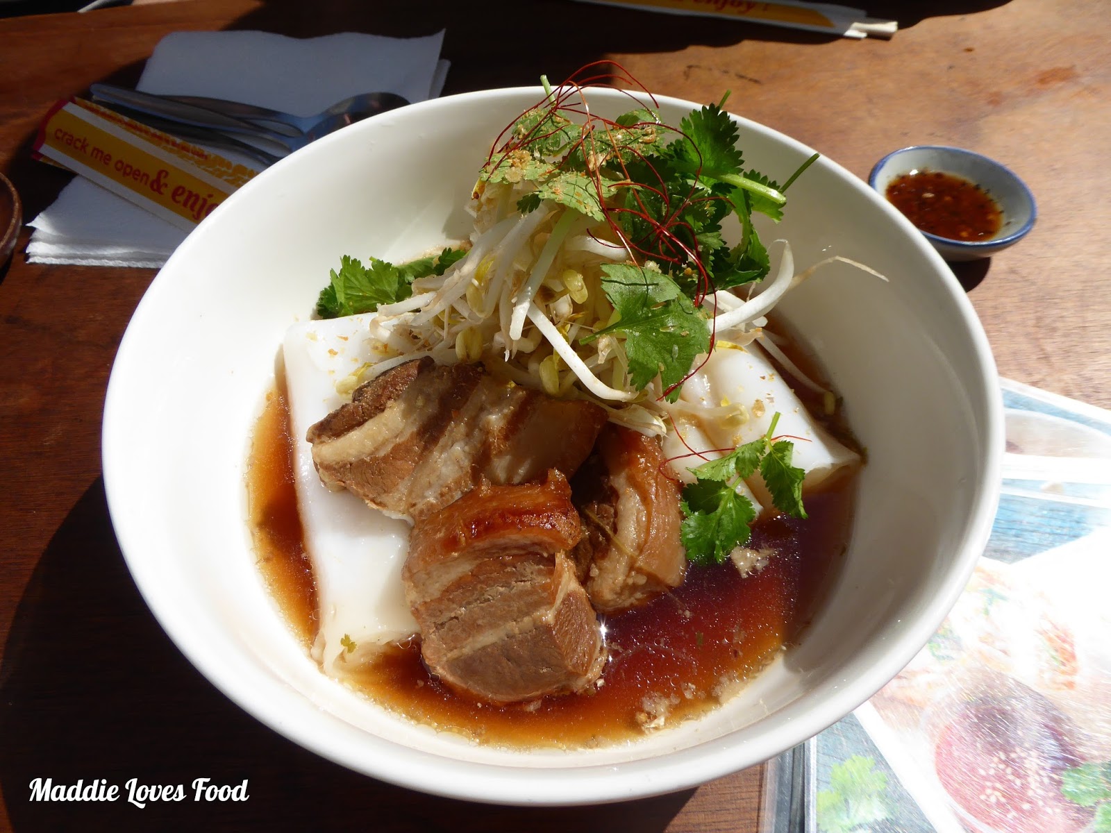 Accompanied by the same soft rice sheets, a herbal pork broth is home to fresh bean sprouts, Vietnamese mint, coriander and gelatinous hunks of stewed pork belly. The flavours and textures are reminiscent of Vietnamese Pho, the major difference being this is a pork version with a slight contemporary twist. The clear soup is very tasty and comforting; it also comes with a homemade roasted garlic and chilli dipping sauce.