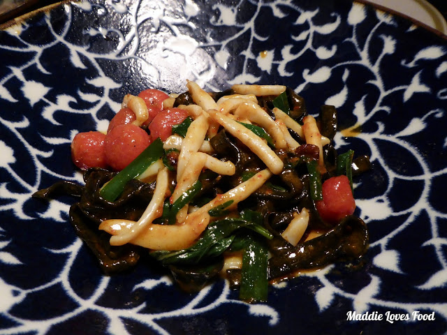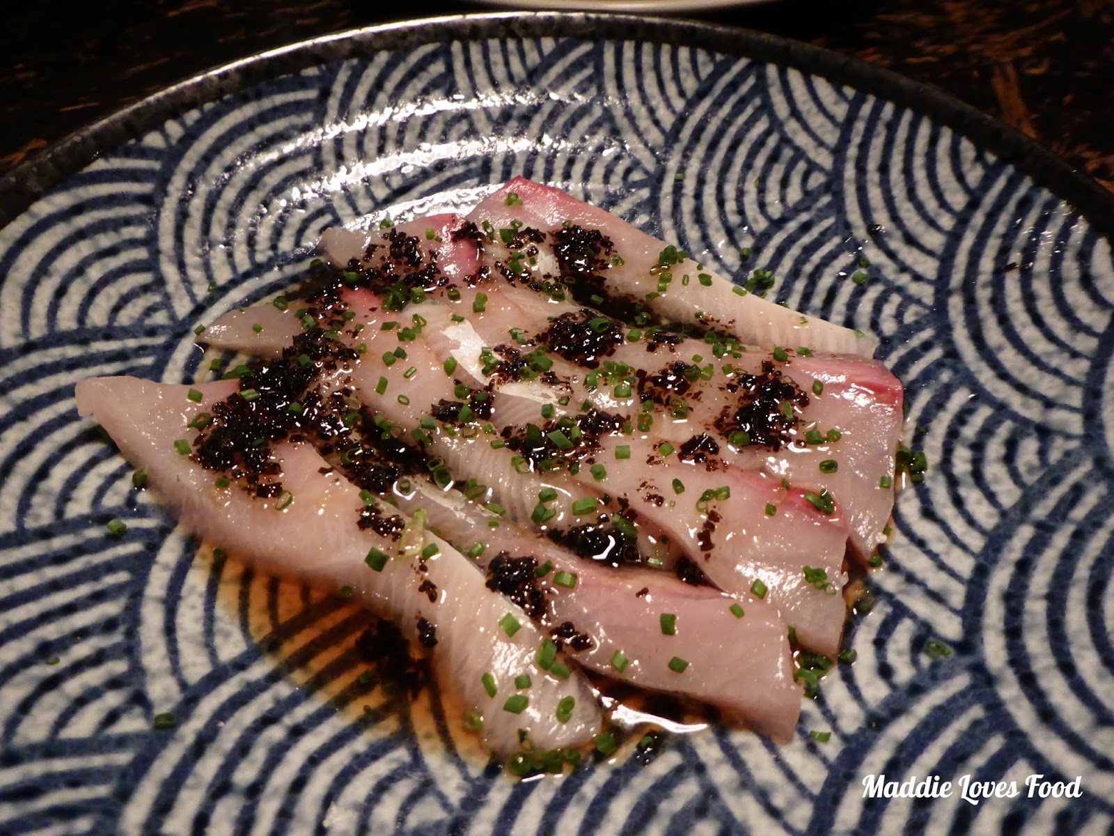 We start with a simple dish of kingfish sashimi, dressed in ponzu and sprinkled with the finest pieces of konbu and chive we’ve ever seen. The ageing of the ponzu, combined with the umami konbu, creates a funky, salty flavour that is reminiscent of Chinese fermented black beans. It really makes the fresh fish come alive.