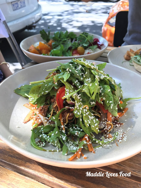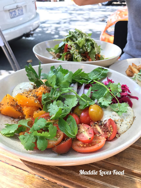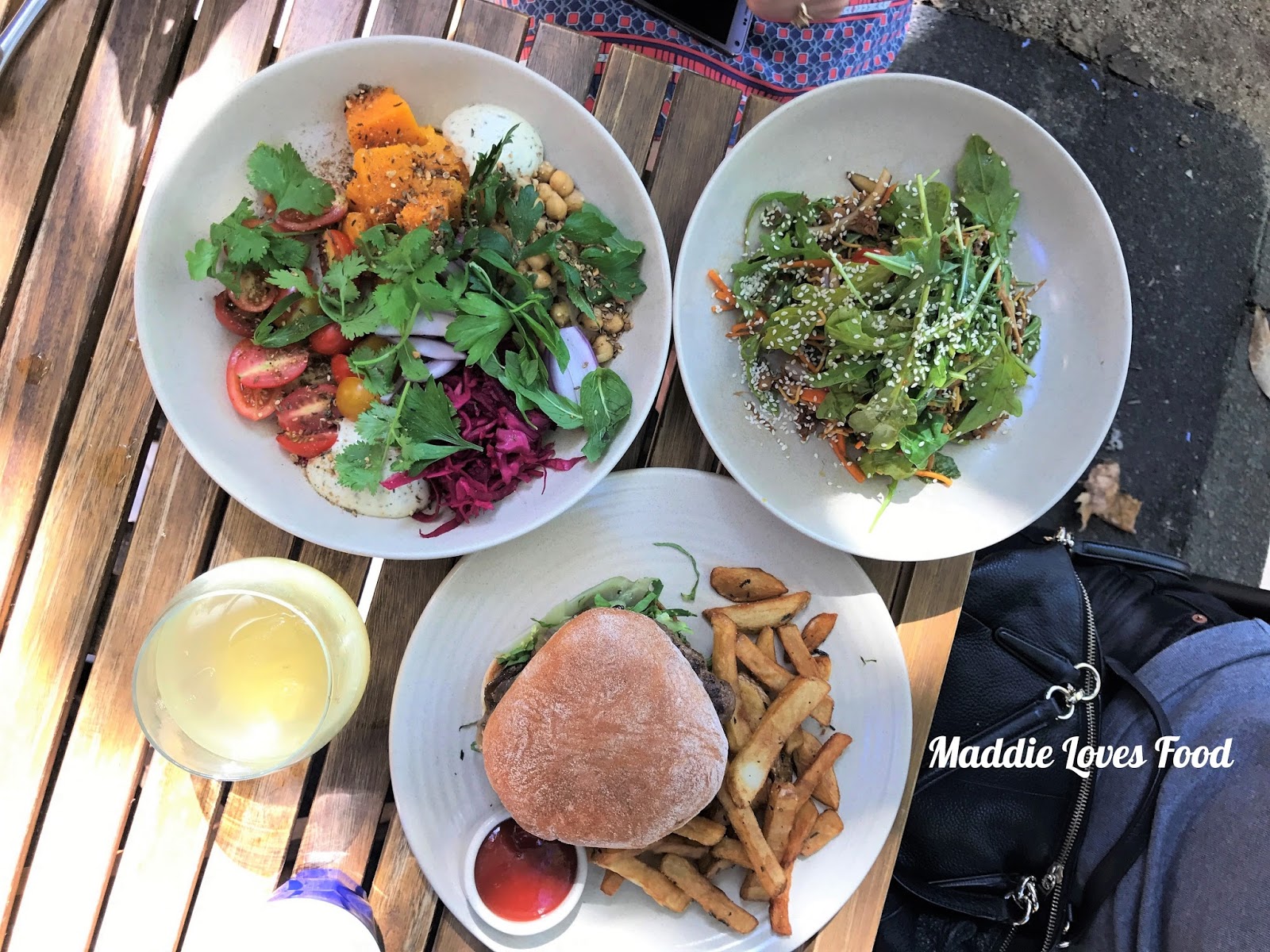 This is one of a few different salads on the lunch menu. It consists of roast pumpkin, pickled red cabbage, tomatoes, parsley, red onion and chickpeas, which are arranged as a deconstructed plate rather than a more conventional tossed salad. A sprinkling of dukkah lifts up each bite of the light, nourishing salad. The smooth, creamy tahini dressing is dolloped on the plate and brings everything together.