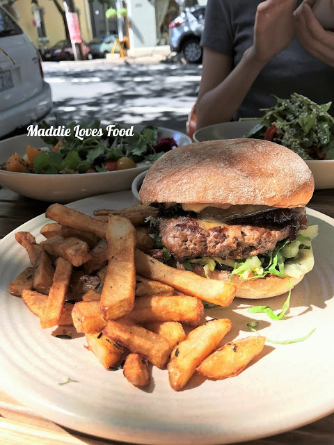 This classic café burger is delicious. Tucked inside a flour-dusted, crusty roll is a tasty wagyu beef patty atop a bed of rocket and lettuce. The patty is moist and pink in the middle, and each mouthful is punctuated with the sweet sourness of gherkin, creamy aioli and tomato chutney. The caramelised onion relish adds a layer of salty richness to the burger. It comes with a side of hand-cut chips that are peppered with herbs and taste like they’ve been baked rather than fried.