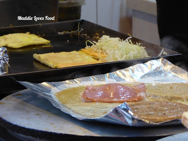 The other components of the filling are cooked separately to the meat. This starts off with a thin egg omelette, upon which sits a pile of shredded cabbage and a square of American-style cheese that melts slightly as it takes on the residual heat from the grill.
