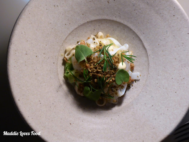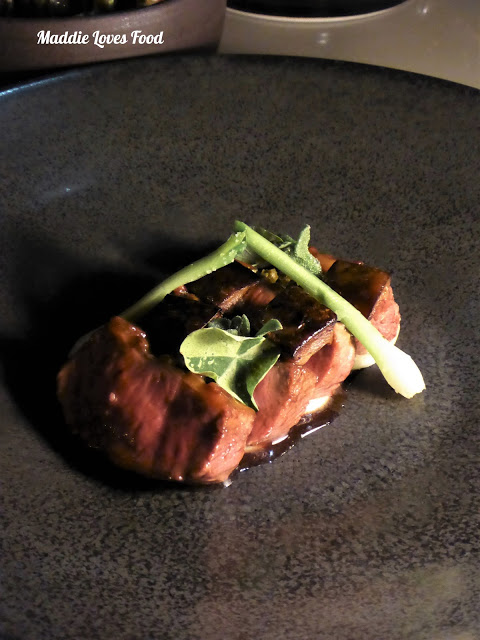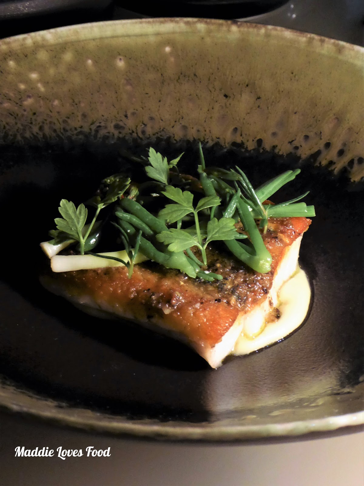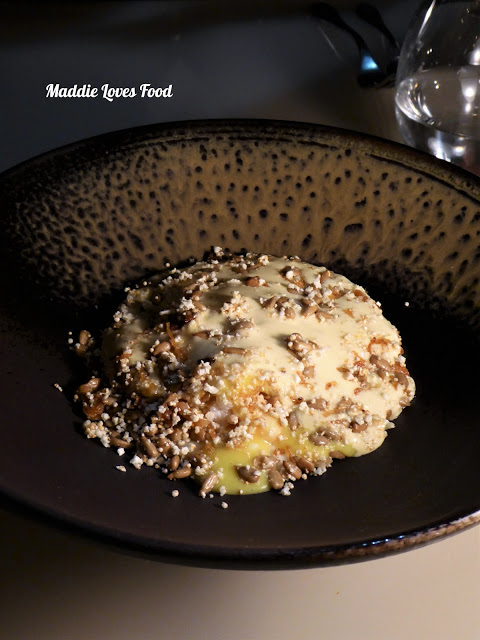 Each mouthful of this dish is a mind-boggling explosion of creamy, sweet-savoury deliciousness. Soft pieces of spanner crab are hidden in a refined, layered mess of soft polenta, young corn and crème fraîche emulsion. A showering of toasty sunflower seeds and tiny popcorn nubbles add crunch, although the crab is the real star of this entrée.