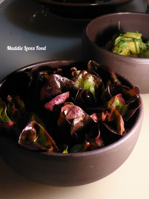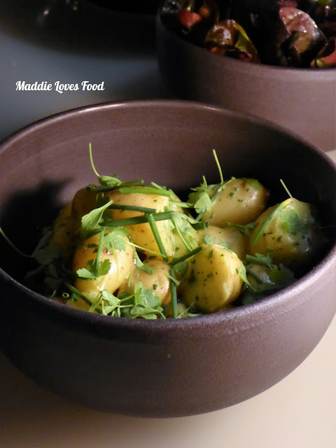 A fresh salad of baby red oak lettuce heads is skillfully dressed in a simple vinaigrette. Robust, unpeeled baby potatoes have a punchy anchovy dressing and are the perfect side to go with our mains.