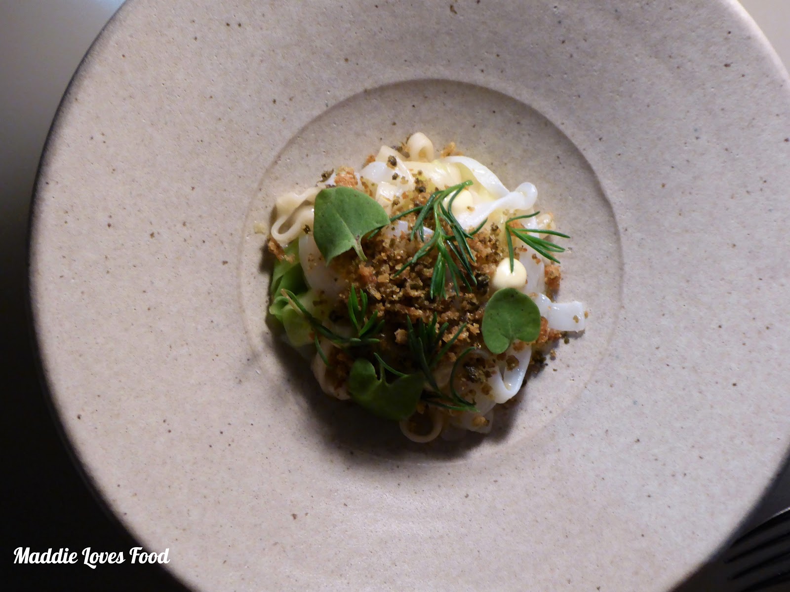This cleverly constructed dish sings of lemon and features house made pasta alongside ribbons of finely sliced squid. The squid has a soft bite and has been prepared in such a way so as to mimic the look and feel of the impeccably cooked pasta. It’s quite possible to mistake one for the other. A golden, pangrattato-like crumb delivers crunch while thin, spindly agretti leaves lend a seasoned, sea-like saltiness.