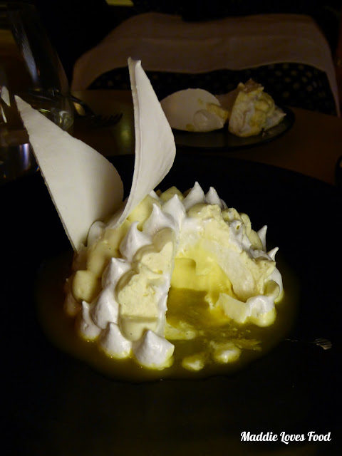 The meringue forms a jubilant half-dome and houses a soft, custardy passionfruit centre that is echoed by a puddle of neon passionfruit sauce. Fine meringue ‘sails’ give this dessert a feel of playfulness and grandeur.