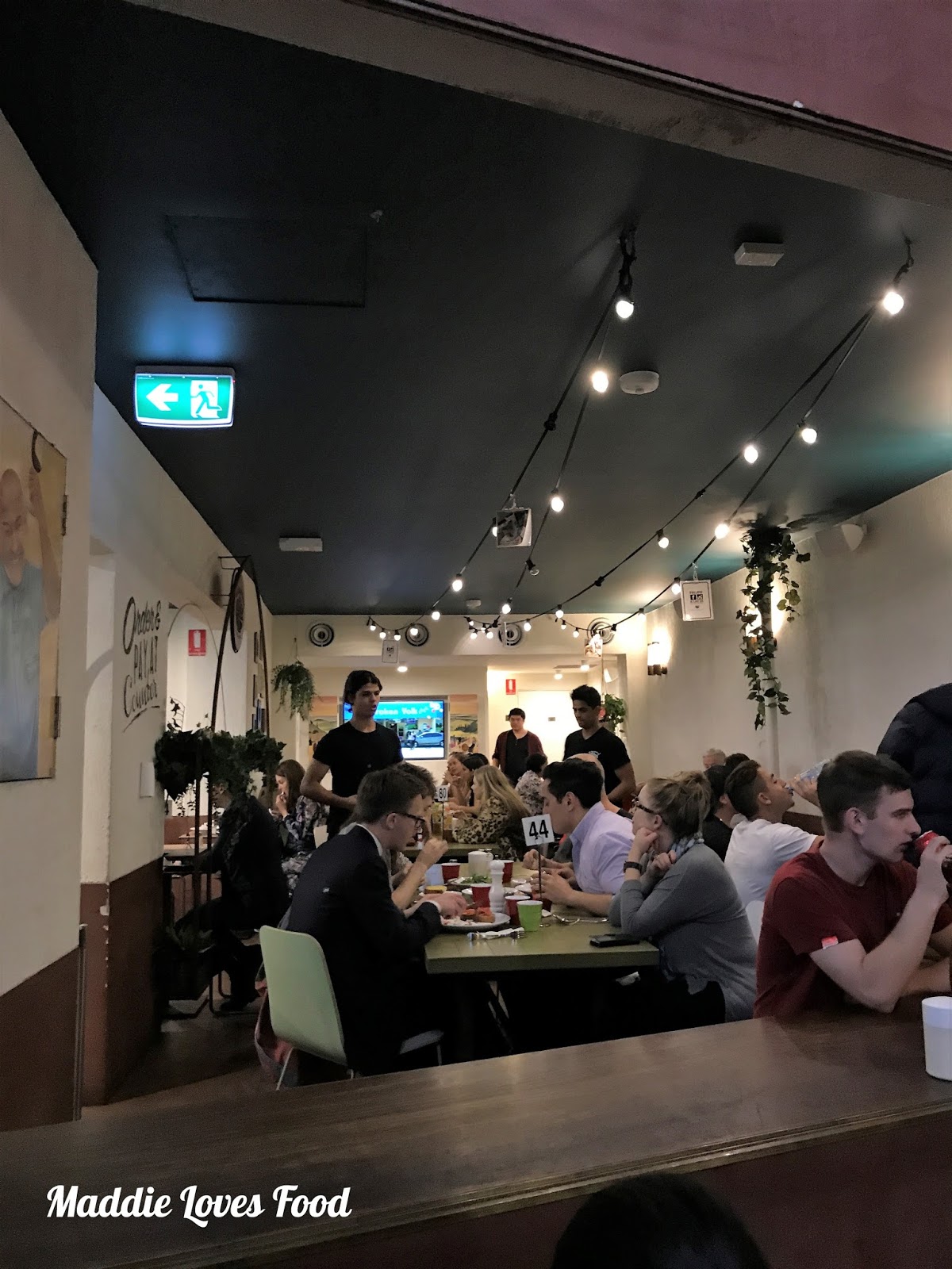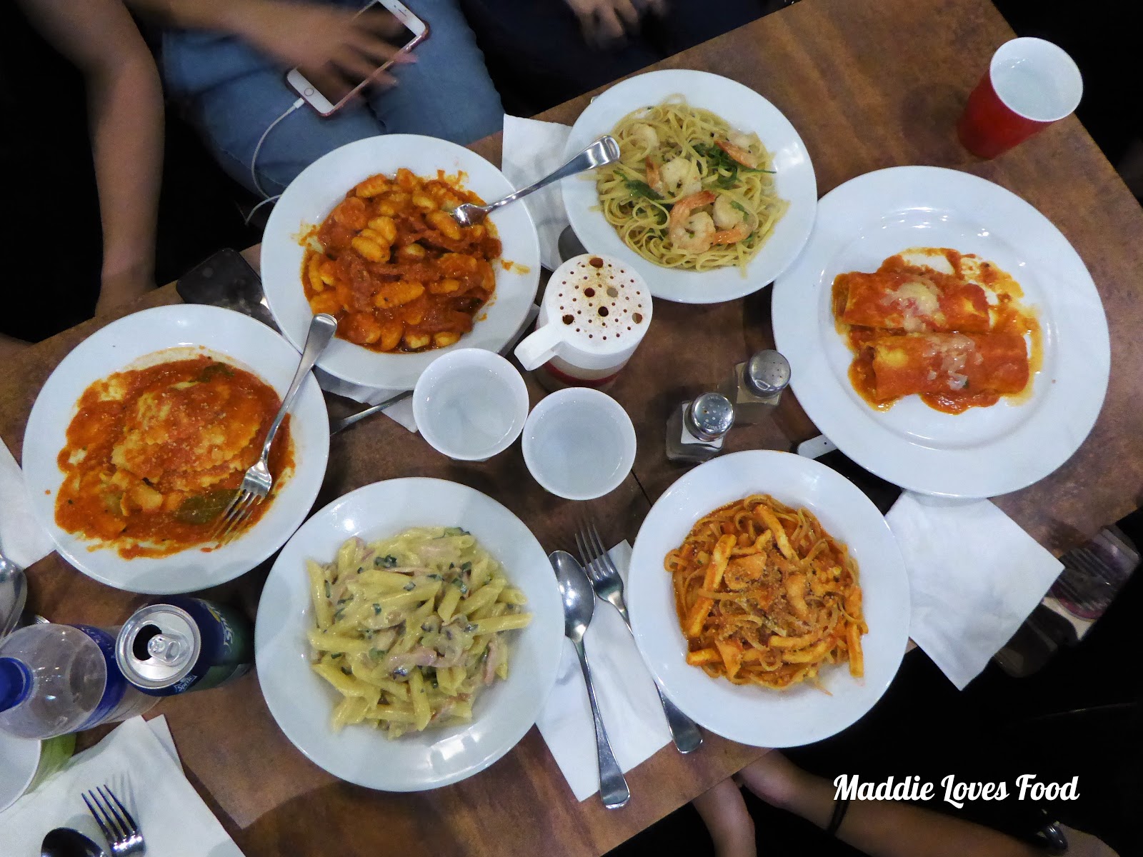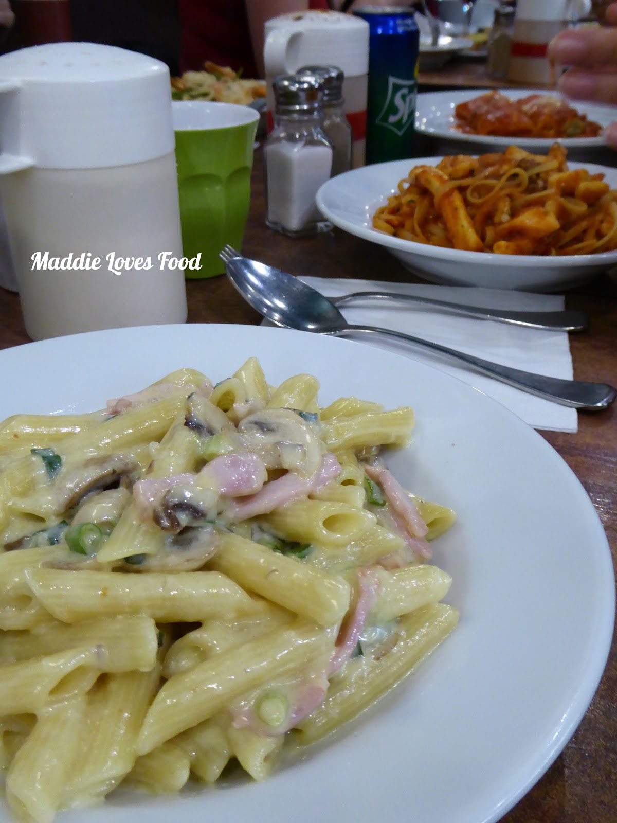 The place is buzzing when we arrive at peak dinner time on a Friday night, with a queue that snakes out the front door and onto the street. The kitchen is an entertaining sight to watch as we wait in line to order. Pots simmer away with steaming vats of sauce; pans sizzle as carby pasta deliciousness is tossed with the various sauces.