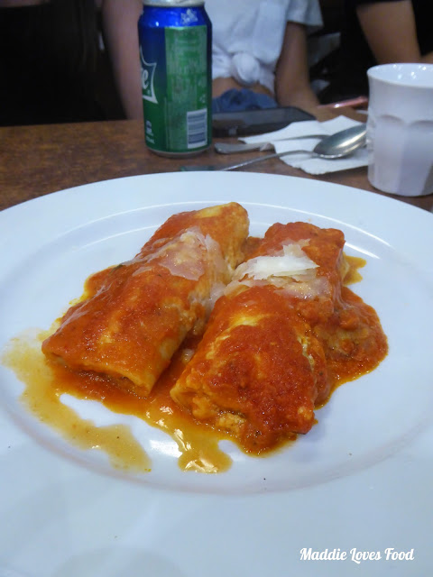 Two long cannelloni hold their shape well and are coated in a thick, flavoursome tomato sauce.