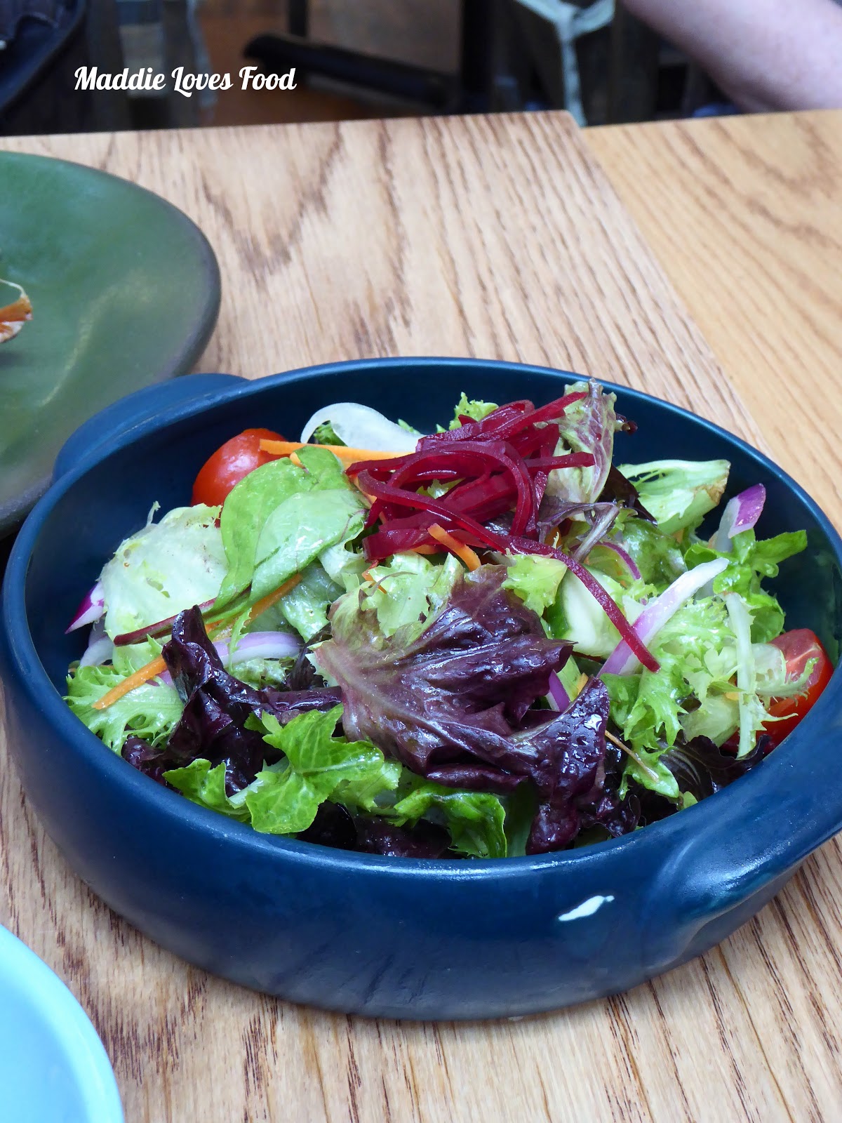 A simple salad of mesclun, cherry tomato, cucumber, carrot and beetroot is dressed in a vinaigrette. It’s a nice, fresh addition to the meal.