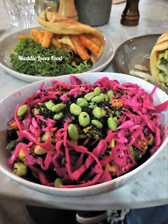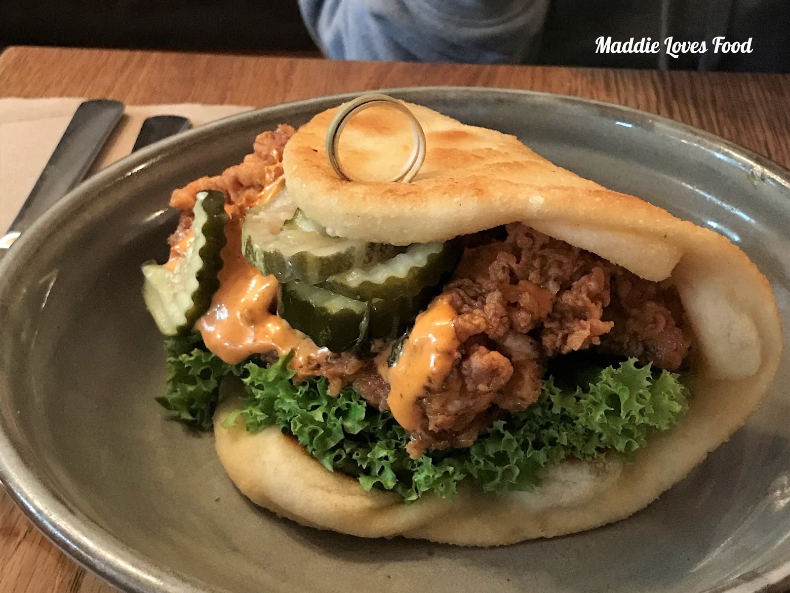 This narnie was probably my favourite of all the narnies. Two majestical pieces of heavenly fried chicken are stuffed inside the naan bread, along with curly coral lettuce, pickled cucumber and bright orange chipotle mayo. Eating this narnie is a wonderfully messy affair, and my dining companion ends up eating this with a knife and fork while I tackle it with my hands. The chicken is fried to perfection, with the perfect crunchy, bubbled batter and succulent meat. The mayo, pickles and lettuce provide cool freshness and zing which counteract the naughtiness of the chicken. The naan withstands the weight of the filling really well.