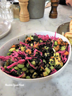 The poke bowl is deceptively large and super delicious. It’s an explosion of colour, with a healthy rainbow of salmon sashimi, cubed cucumber, avocado, and pink-hued pickled red cabbage on a bed of jet black rice. The soy and mirin dressing is fresh and vibrant.