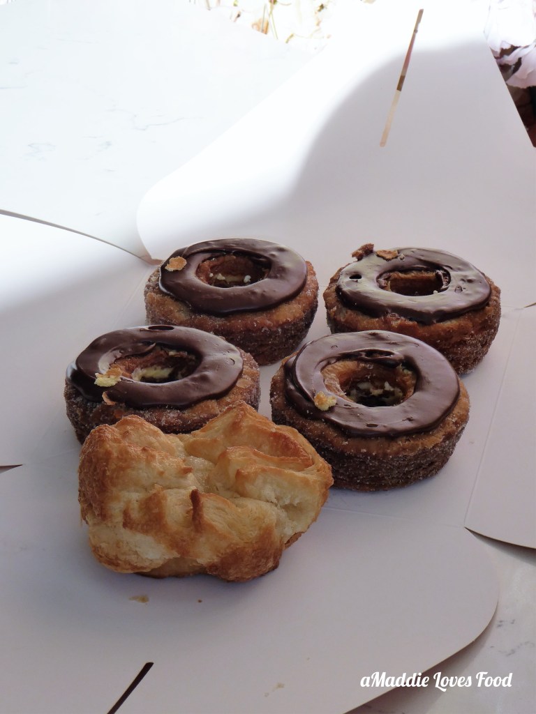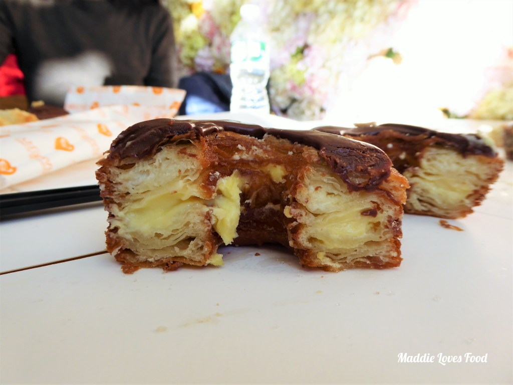 There is only one flavour of Cronut available on the menu which changes every month. The flavour when we visit is Boston Cream Pie, which is filled with a layer of yellow cake ganache and pastry cream and topped with dark chocolate glaze. This Cronut is right up our alley – the filling is silky and creamy, and the combination of chocolate and vanilla is sublime. I’ve had cronuts in Sydney before but this is just next level. It embodies all the best bits of a croissant and a doughnut with its golden, sugar-coated crust and flaky layers.