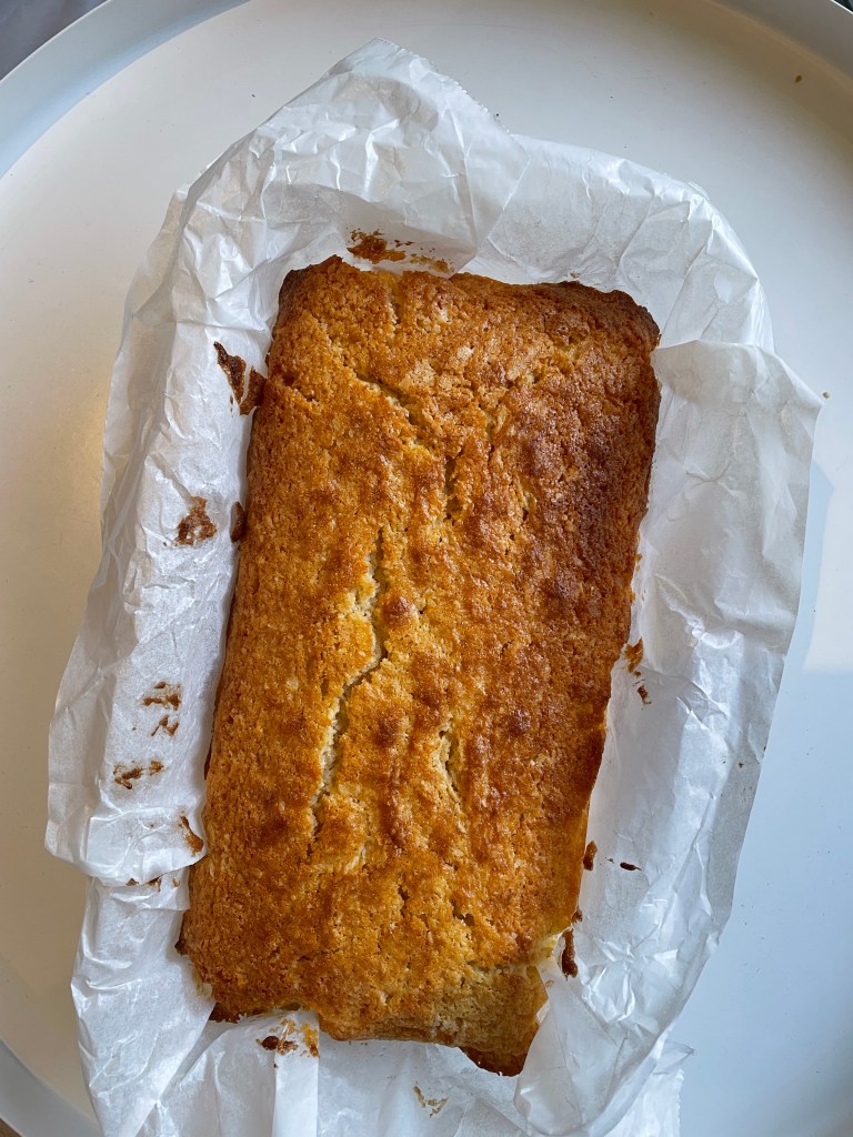 I love eating this loaf warmed with a scoop of vanilla ice cream or double cream. It gains a lovely golden caramelised crust in the oven, and stays super moist for a couple of days.